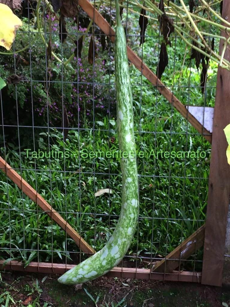 Interessante e belo porongo com seus desenhos em tons de verde, seus frutos podem chegar a 2 metro de comprimento, no solo podem desenvolver vários formatos lembrando uma cobra.